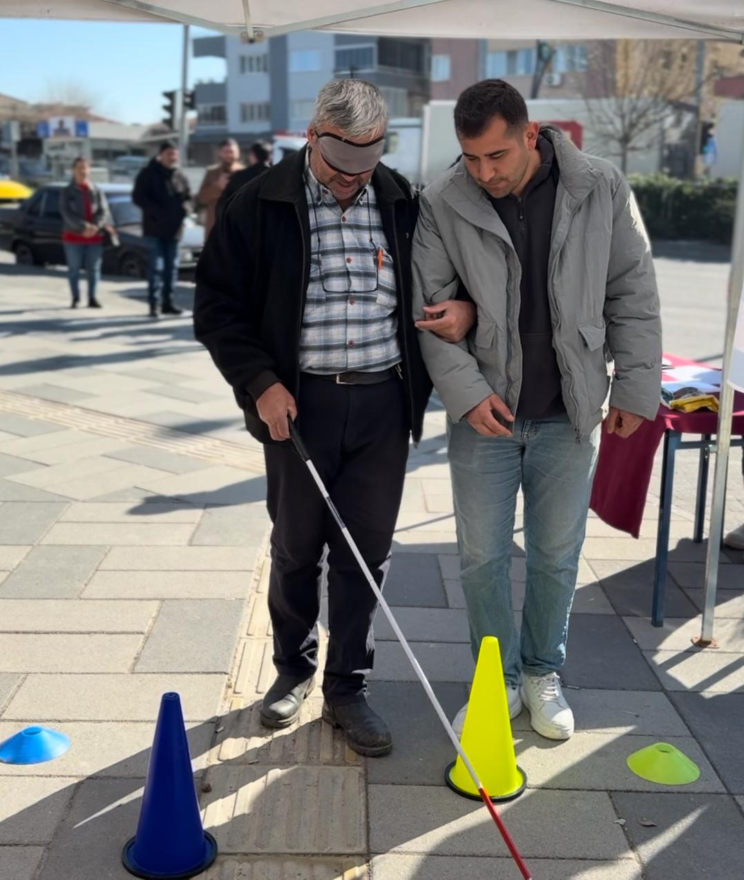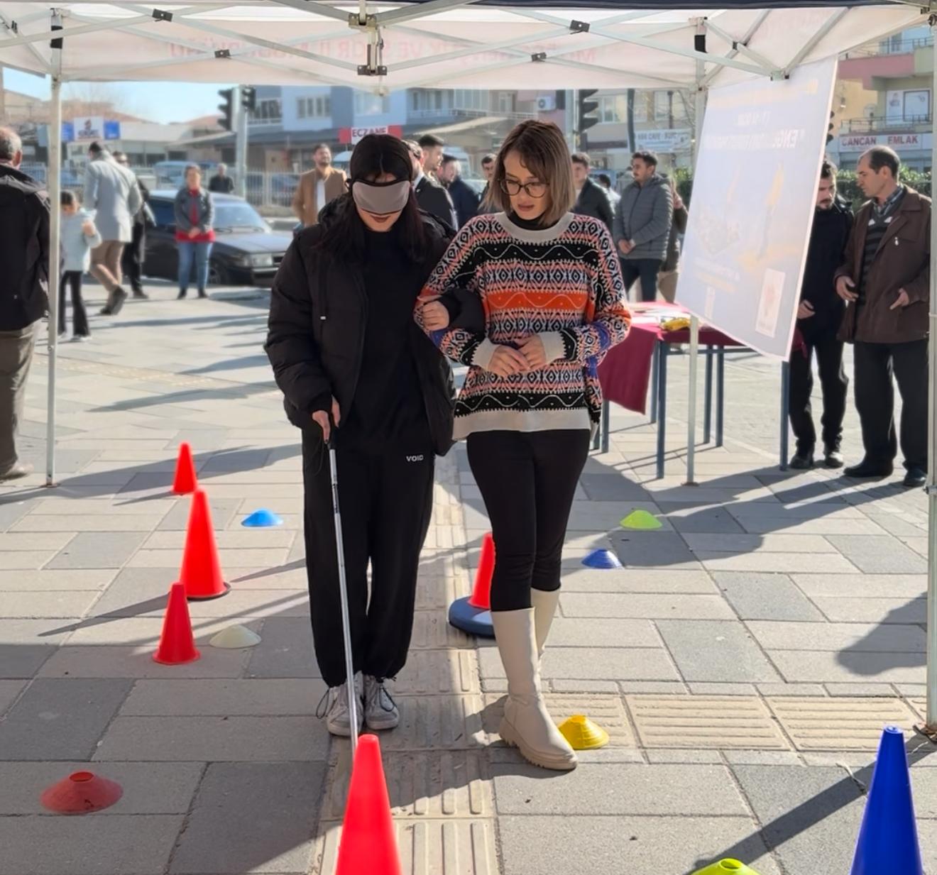 Etkinlik kapsamında parkuru deneyimlemek isteyen vatandaşlar, gözleri kapalı şekilde beyaz baston kullanarak 1 dakika boyunca empati parkurunda yürüdü.
