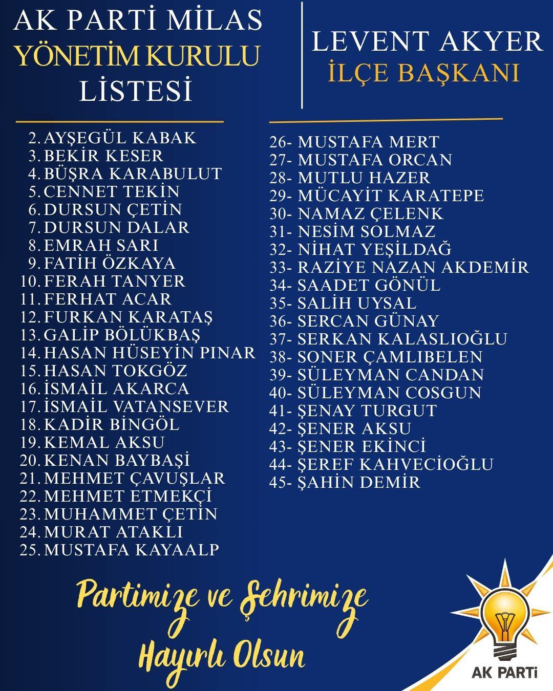 AK Parti Milas İlçe Başkanlığı’nın yeni yönetim kurulunda şu isimler yer aldı: