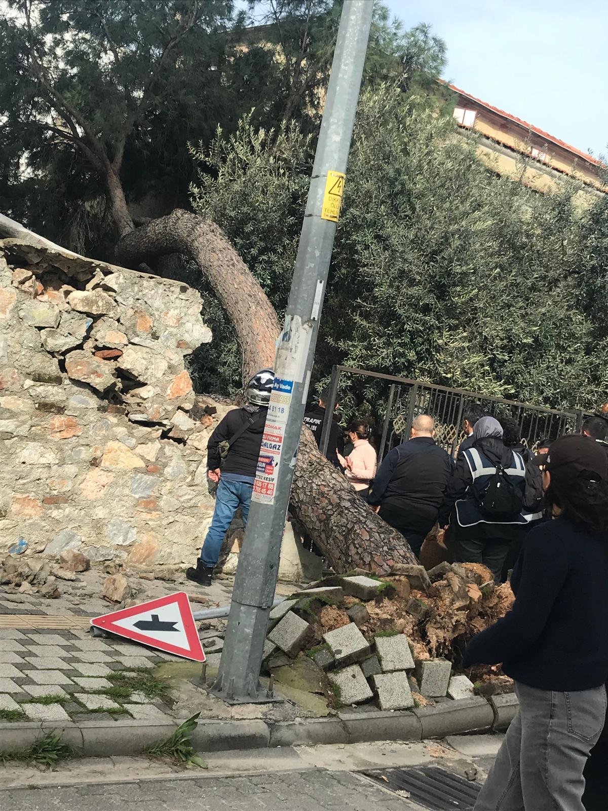 Tarihi Makam Murat Evi’nin bahçe duvarına devrilen ağaç, duvarın yıkılmasına neden oldu.