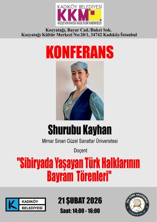 Not: Doçent Shurubu Kayhan, Sibirya’da Yaşayan Türk halklarının bayram törenleri konusunda bir konferans verecek. Tarih: 21 Şubat 2026 Cumartesi Yer: Kozyatağı, Bayar Cad. Buket Sok. Kozyatağı Kültür Merkezi No 201/1 Kadıköy - İSTANBUL