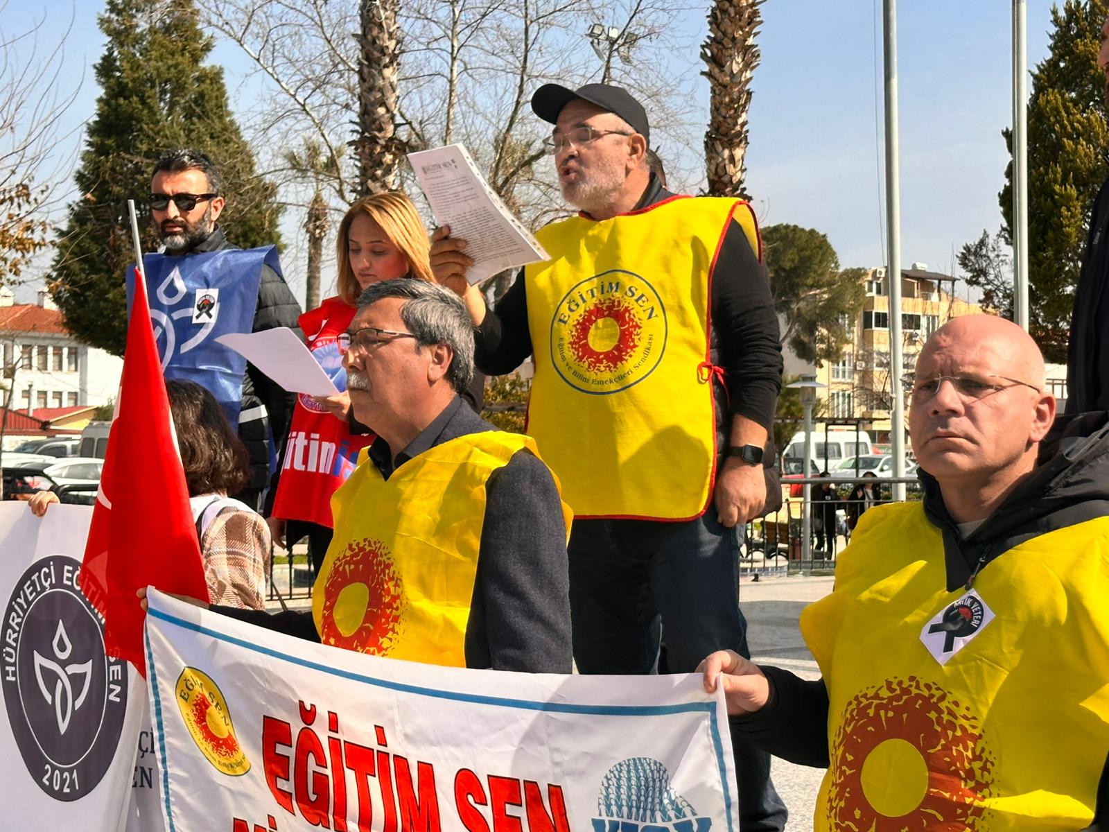 Atapark’ta gerçekleştirilen basın açıklaması Mehmet Çelik (Hürriyetçi Eğitim Sen), Hamza Göncü (Eğitim Sen), Ayşe Yılmaz (Eğitim İş), Ufuk Gök (Eğitimin Gücü Sen) ve Erdal Kulaç (METESEN) tarafından okundu.