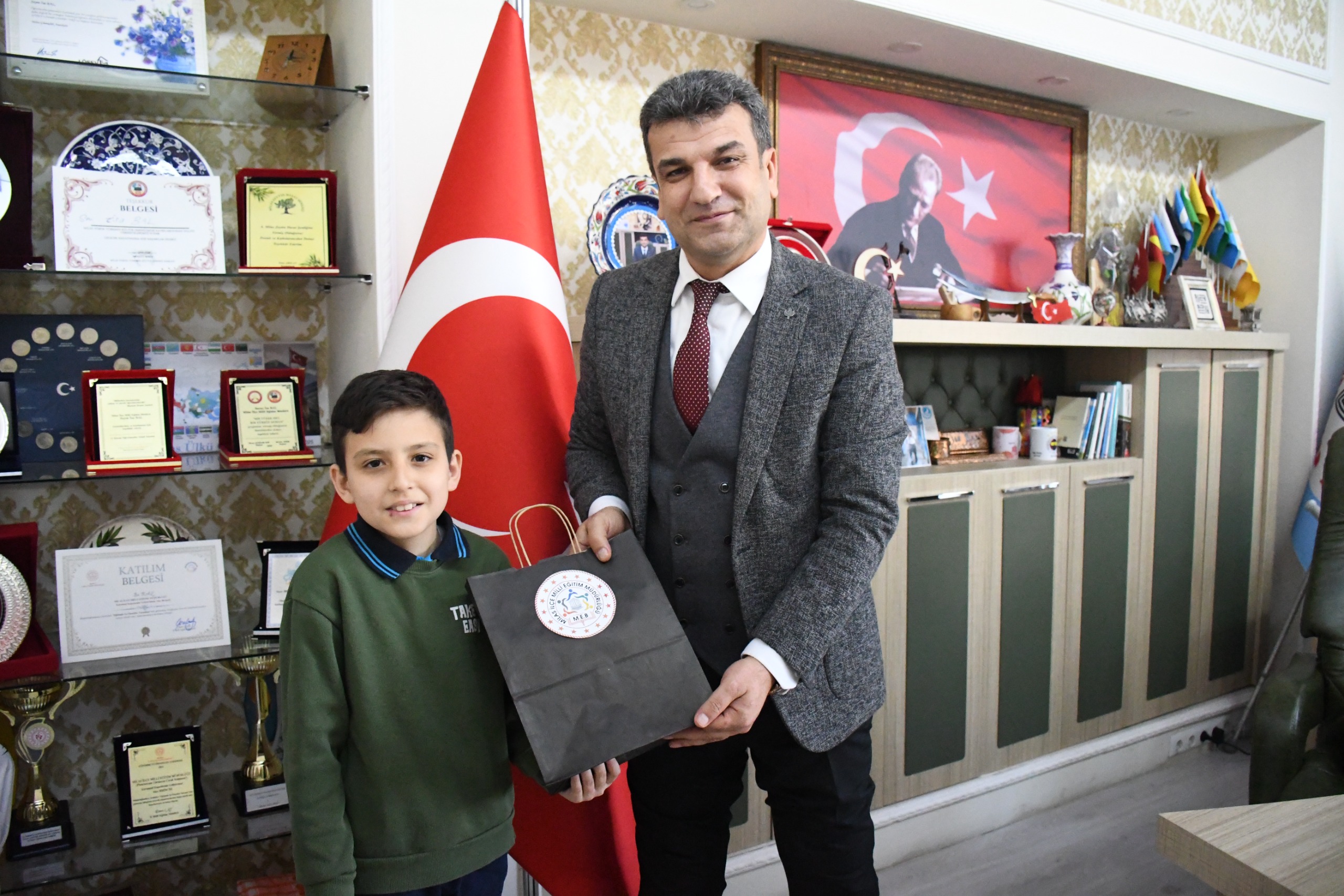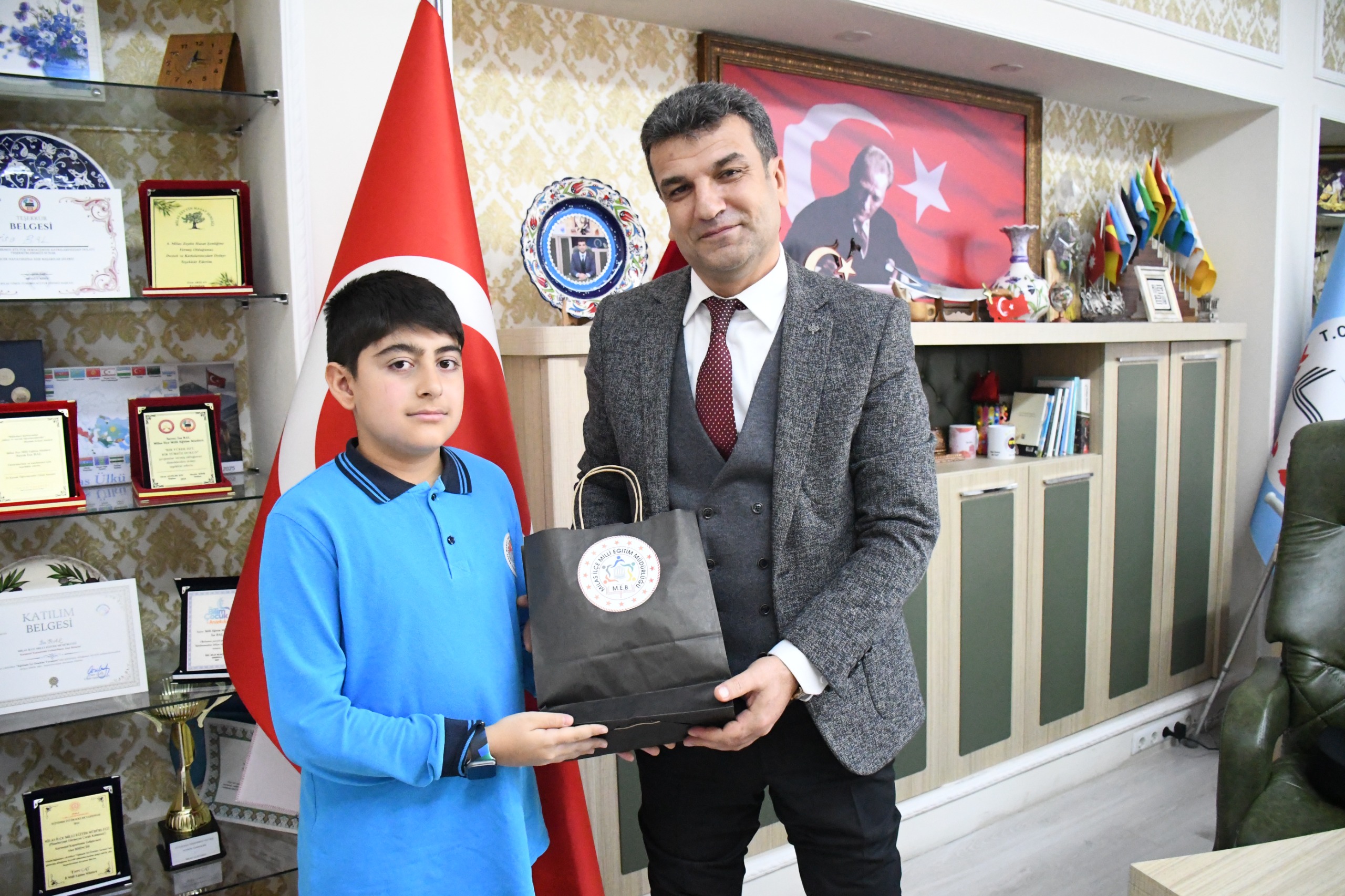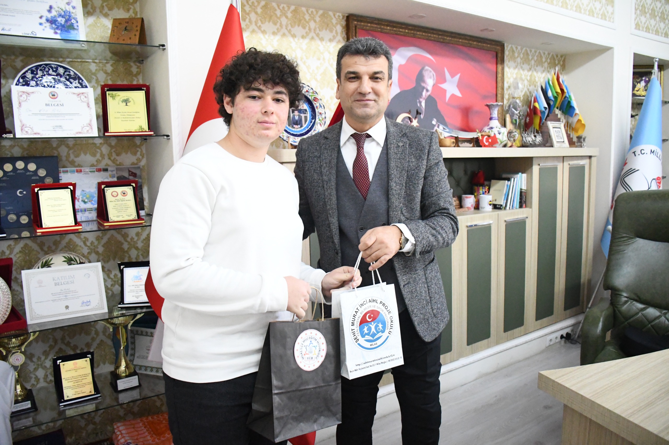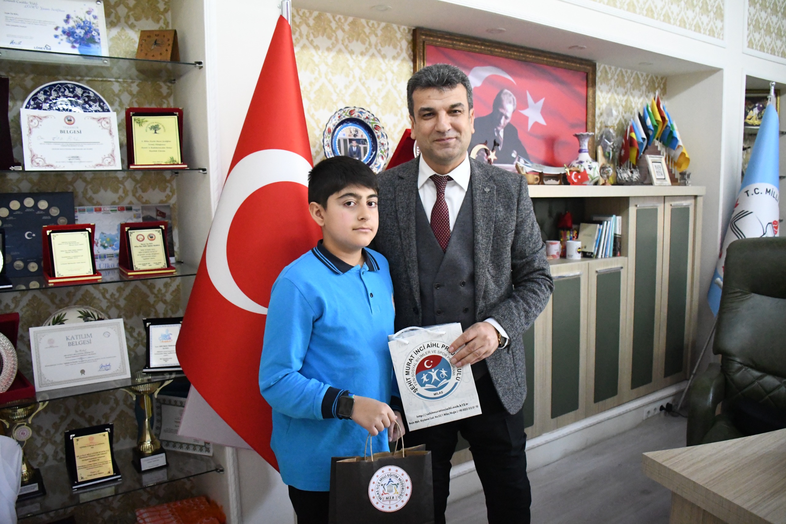 Ziyaretin sonunda Milas İlçe Millî Eğitim Müdürü İsa Bal, öğrencileri tekrar tebrik ederek hediyelerini takdim etti.