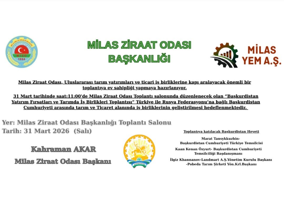 31 Mart Salı günü saat 11.00’de Milas Ziraat Odası Toplantı Salonu’nda gerçekleştirilecek olan “Başkortostan Yatırım Fırsatları ve Tarımda İş Birlikleri Toplantısı”, Türkiye ile Rusya Federasyonu’na bağlı Başkurdistan Cumhuriyeti arasında tarım ve ticaret alanında yeni iş birliklerinin geliştirilmesini amaçlıyor.