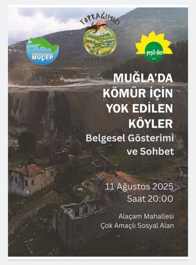 Muğla Çevre Platformu (MUÇEP), “Toprağımızı Vermiyoruz” İnisiyatifi ve Yeşil-Der iş birliğiyle “Muğla’da Kömür İçin Yok Edilen Köyler” adlı belgesel, 11 Ağustos 2025 Pazartesi günü saat 20.00’de Alaçam Mahallesi Çok Amaçlı Sosyal Alan’da izleyiciyle buluşacak.