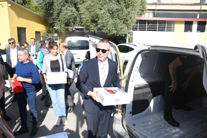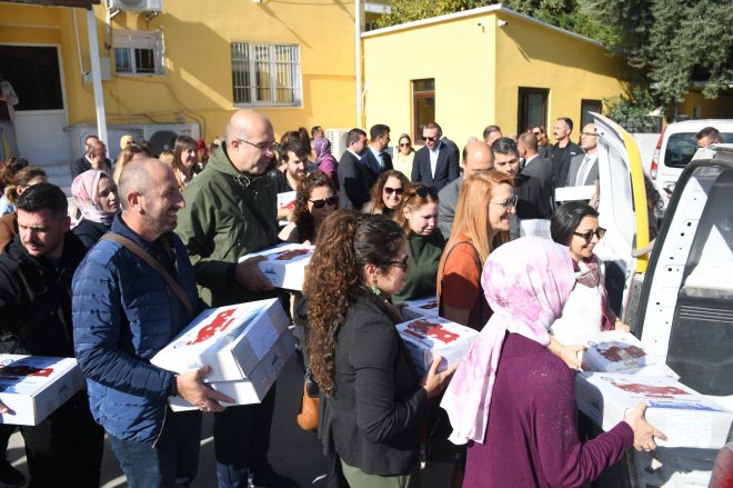Yapılan konuşmaların ardından törene katılan öğretmenler tarafından hediye kolileri PTT Kargo aracına yüklendi.