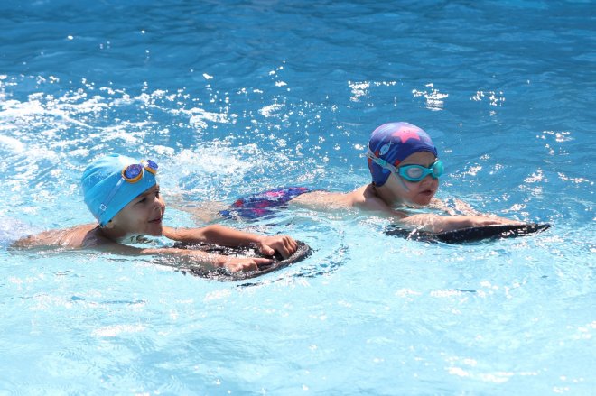 Muğla Büyükşehir Belediyesi’ne ait Yatağan Hasan Haşmet Işık Yüzme Havuzu ve Sosyal Tesisleri’nde gerçekleştirilen ücretsiz kurslarda, 6-12 yaş grubundaki çocuklar uzman eğitmenler eşliğinde yüzme eğitimi alıyor.