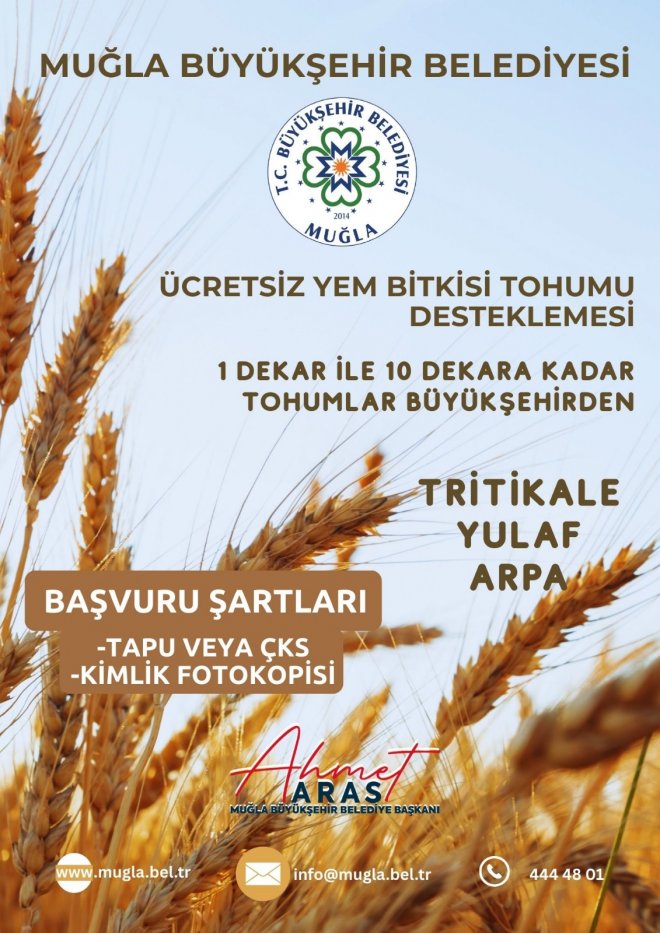 Muğla Büyükşehir Belediyesi, kırsal kalkınmayı desteklemek ve üreticilerin en büyük gider kalemlerinden biri olan yem maliyetlerini azaltmak amacıyla önemli bir destek programı başlattı. 1 ila 10 dekar arazi varlığı bulunan üreticiler, Tritikale, Arpa ve Yulaf tohumu için ücretsiz destekten faydalanabilecek.