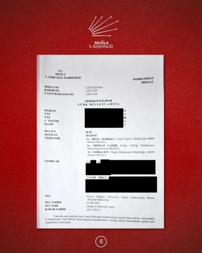 CHP Muğla İl Örgütü olarak; evrakta sahtecilikten cezası kesinleşmiş bu kişinin bu görevde daha fazla tutulmasını kabul etmiyoruz.