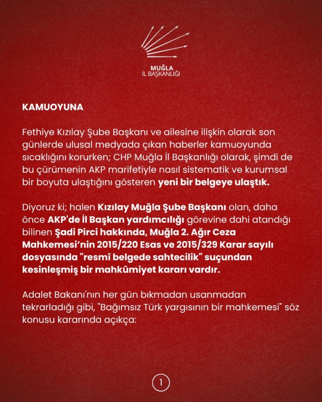 “Fethiye Kızılay Şube Başkanı ve ailesine ilişkin olarak son günlerde ulusal medyada çıkan haberler kamuoyunda sıcaklığını korurken; CHP Muğla İl Başkanlığı olarak, şimdi de bu çürümenin AKP marifetiyle nasıl sistematik ve kurumsal bir boyuta ulaştığını gösteren yeni bir belgeye ulaştık.