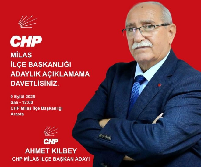CHP Milas İlçe Başkanlığı’na yeniden aday olan Ahmet Kılbey, 9 Eylül 2025 Salı günü saat 12.00’de Arasta’da bulunan ilçe başkanlığı binasında yapacağı adaylık açıklamasına parti üyelerini davet etti.