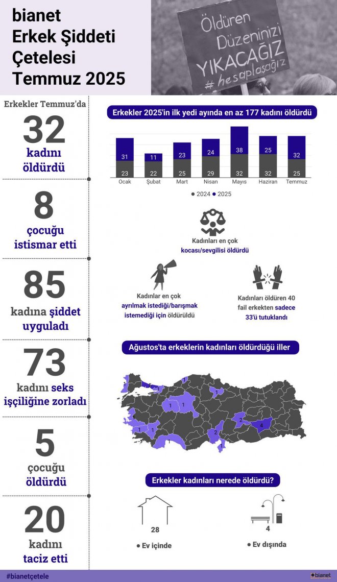 Bianet’in düzenli olarak yaptığı yerel ve ulusal gazetelerden, haber sitelerinden ve ajanslardan derlediği haberlere göre erkekler, Temmuz 2025’te en az 32 kadını ve beş çocuğu öldürdü.
