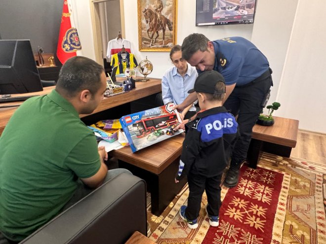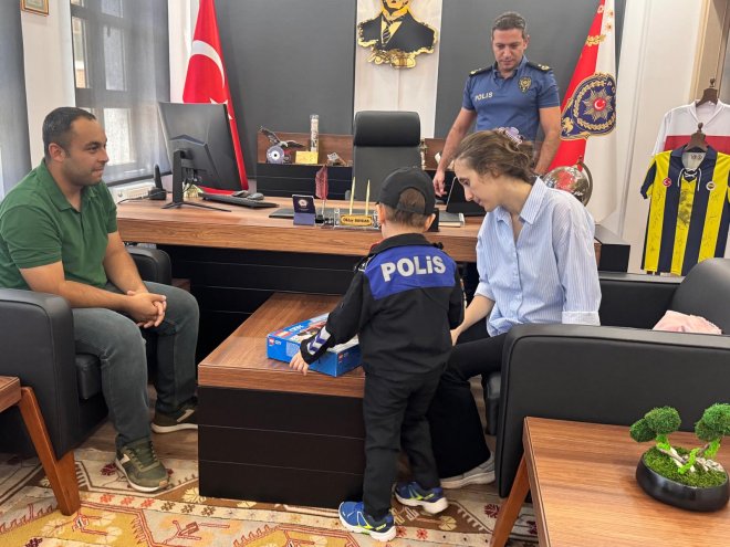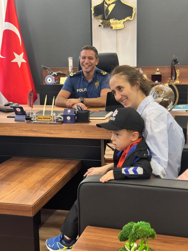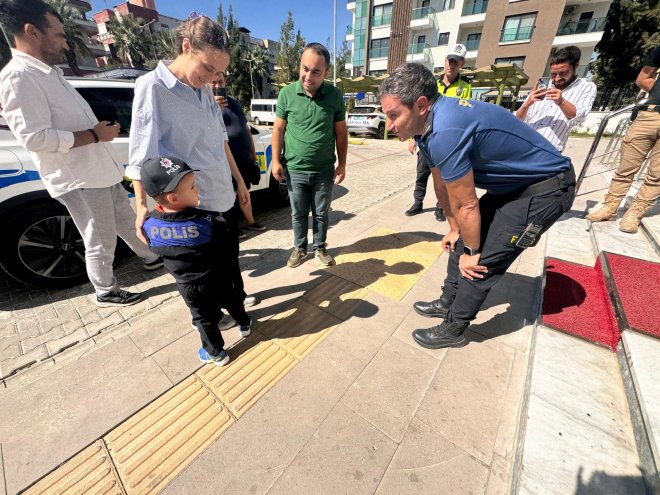 Milas’ta dayanışma örneğiyle moral bulan minik Göktuğ, hayalini kurduğu polislik mesleğini bir günlüğüne de olsa yaşama fırsatı buldu.
