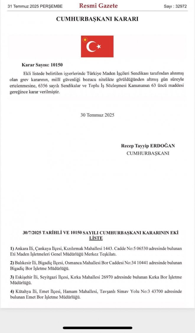 30 Temmuz 2025 tarihli Resmî Gazete’de yine bir grev yasağı kararı yayımlandı ve Eti Maden grevinin yasaklanmasıyla AKP döneminde 22 yılda toplam 22 grev yasaklanmış oldu.