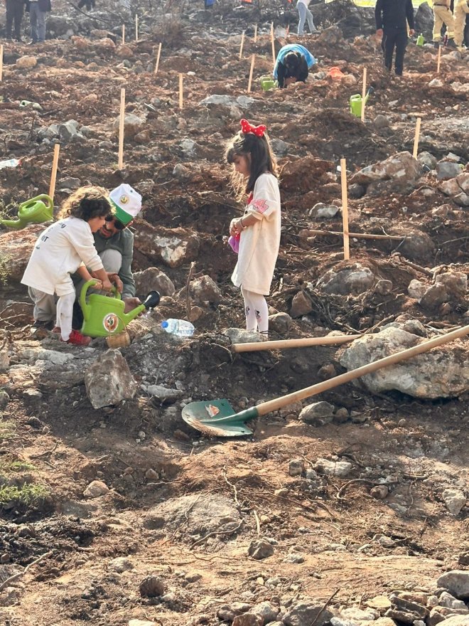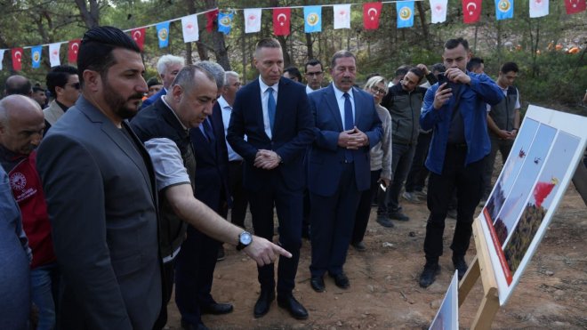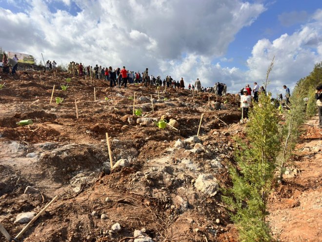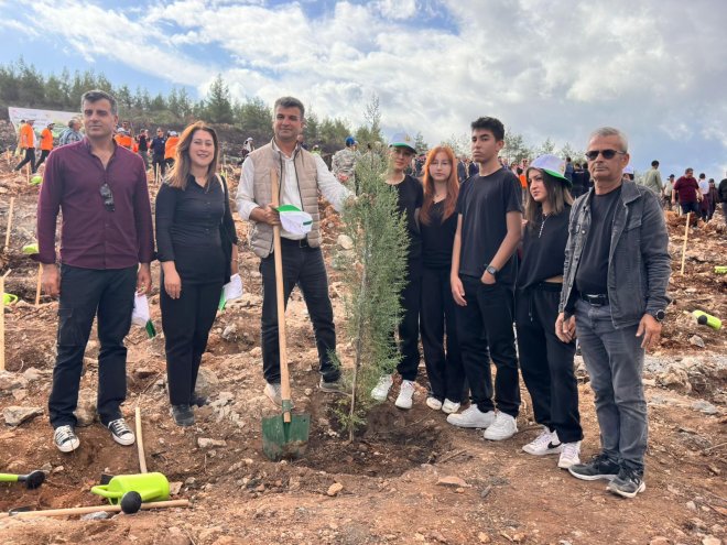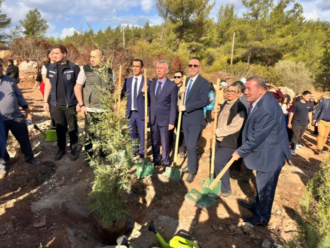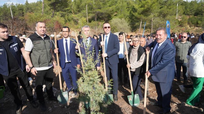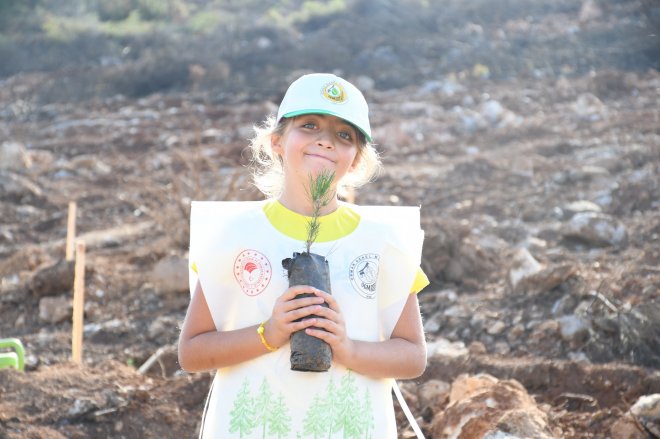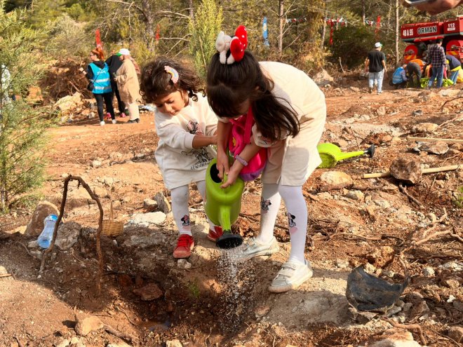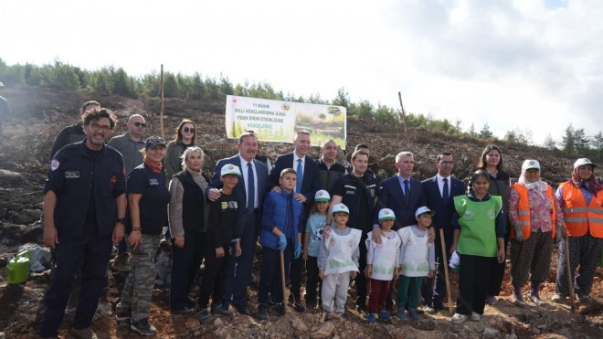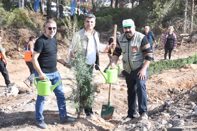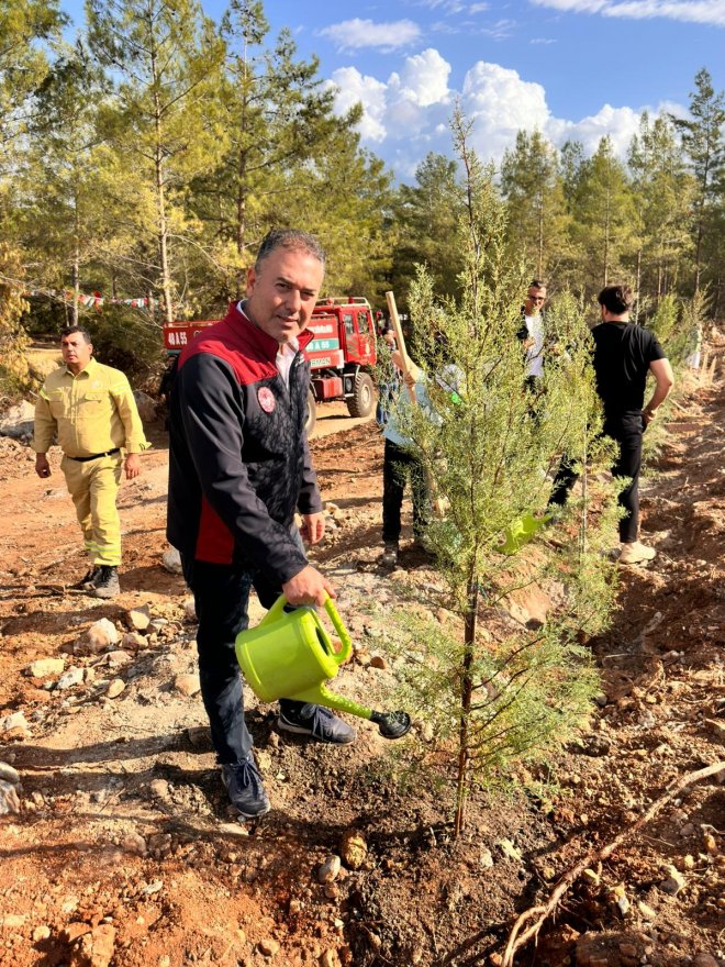 Konuşmaların ardından Mumcular yol ayrımında çıkan yangında kül olan alanda fidan dikimi yapıldı. Kızılçam ve Harnup fidanları törene katılanlar tarafından toprakla buluşturuldu. Can suları verildi.