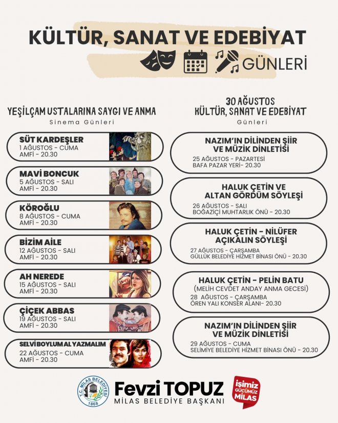 Milas Belediyesi tarafından gerçekleştirilecek olan Kültür, Sanat ve Edebiyat Günleri Ağustos ayının ilk günü itibariyle Yeşilçam Ustalarına Saygı ve Anma programı başlayacak.