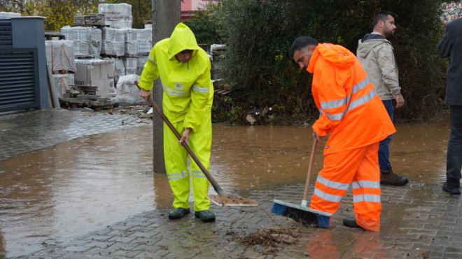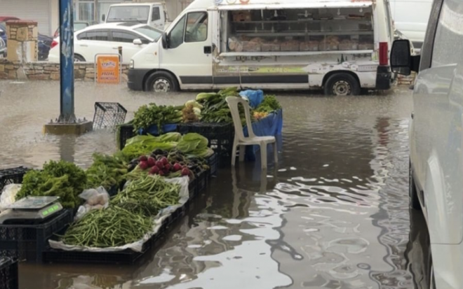 İsmetpaşa Mahallesi’ndeki Cumartesi pazarı, yağışla birlikte kısa sürede su altında kaldı. Belediye ekiplerinin hızlı müdahalesiyle su tahliye edildi.