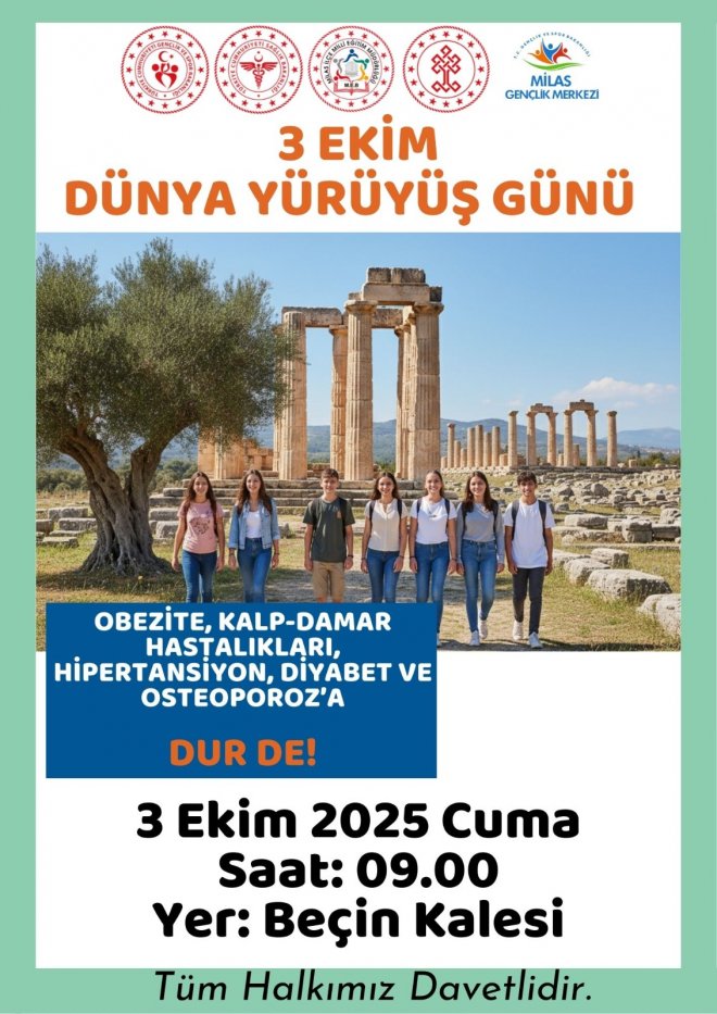 Milas Gençlik Merkezi Müdürlüğü koordinasyonunda, İlçe Sağlık Müdürlüğü, İlçe Milli Eğitim Müdürlüğü ve Milas Müze Müdürlüğü iş birliğiyle düzenlenecek yürüyüş etkinliği, 2 Ekim 2025 Perşembe günü saat 09.00’da ilçemizin önemli antik kenti olan Beçin Kalesi’nde başlayacak.