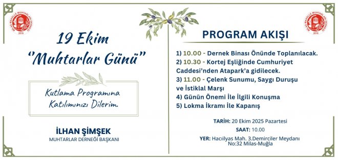 Milas Mahalle Muhtarları Derneği, 19 Ekim “Muhtarlar Günü” dolayısıyla bir kutlama programı düzenliyor.