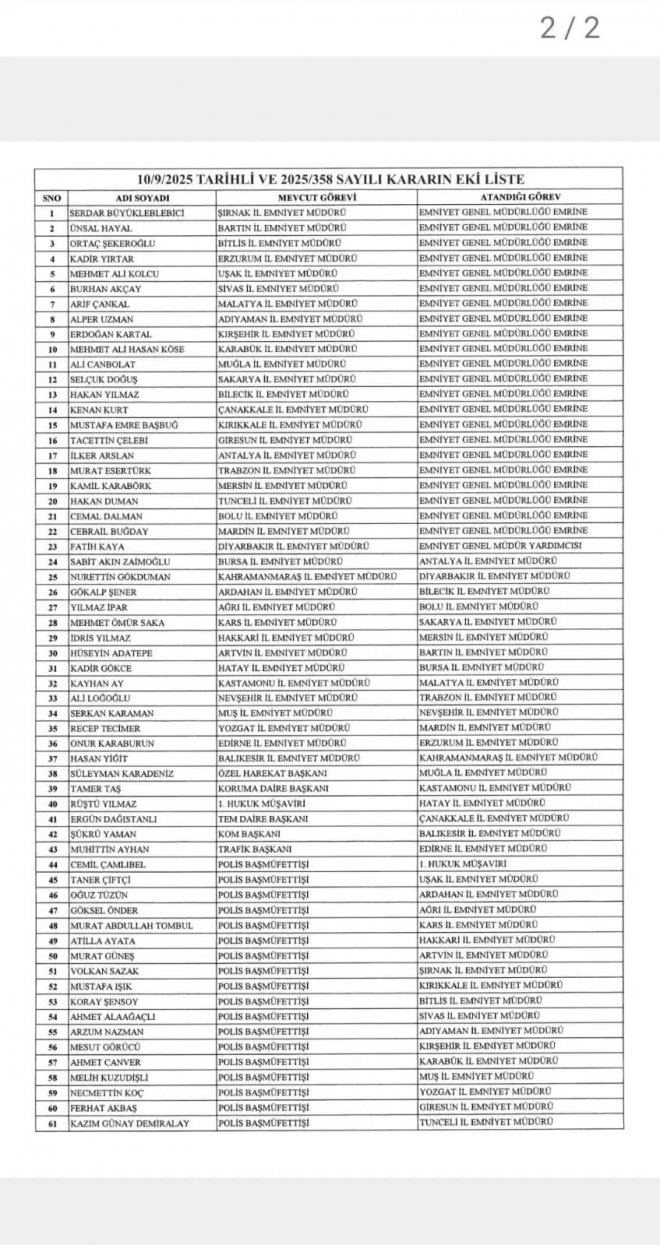 Cumhurbaşkanı Recep Tayyip Erdoğan’ın imzasıyla 11 Eylül 2025 tarihli Resmi Gazete’de yayımlanan kararname ile birçok ilin Emniyet Müdürü değişti. Kararnameye göre 37 ilin Emniyet Müdürü değişirken, 22 Emniyet Müdürü merkeze çekildi.