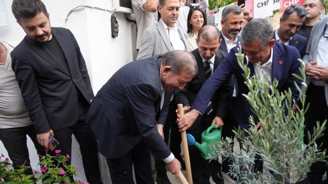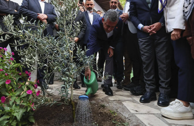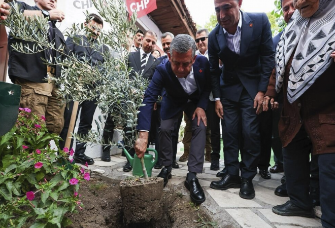 dizelerine atıf yapan CHP Genel Başkanı Özgür Özel, Menteşe İlçe Binası bahçesine sembolik bir zeytin fidanı dikti. Fidanın ilk can suyunu Özel verirken, Milas Belediye Başkanı Fevzi Topuz da dikime destek verdi.