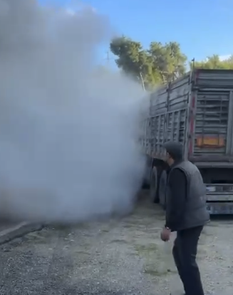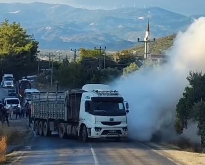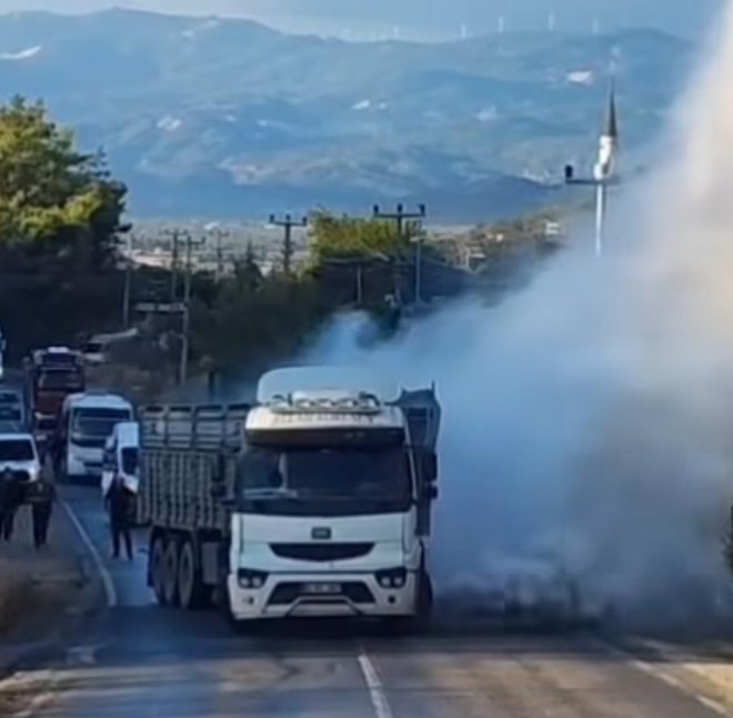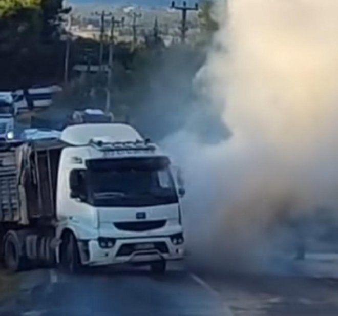 Milas–Ören karayolu üzerinde seyir halinde ilerleyen 01 RZ 067 plakalı TIR’ın motor kısmı, henüz belirlenemeyen bir nedenle alev aldı. Motor bölümünden yükselen yoğun duman ve alevler nedeniyle görüş mesafesi kapanırken, trafikte kısa süreli aksama yaşandı.
