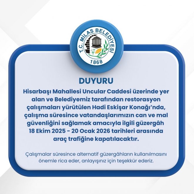Milas Belediyesi tarafından restorasyon çalışmaları yürütülen Hadi Eskişar Konağı nedeniyle, PTT Milas Merkez Şubesi'nin bulunduğu Hisarbaşı Mahallesi Uncular Caddesi, 18 Ekim 2025 - 20 Ocak 2026 tarihleri arasında araç trafiğine kapatılacak.