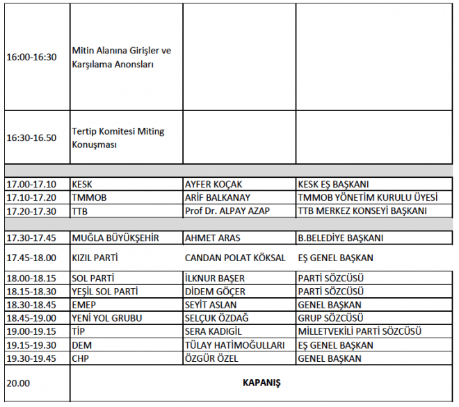 Yarınki büyük miting saat 18:00’de Menteşe Atatürk Bulvarı’ndaki miting alanında yapılacak. 15’er dakikalık konuşmaların en sonunda Serra Kadıgil, Tülay Hatimoğulları ve Özgür Özel konuşacaklar.