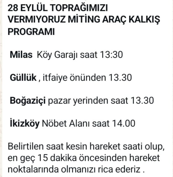 “Toprağımızı Vermiyoruz” mitingi, yarın (28 Eylül 2025) saat 18:00’de Menteşe’de yapılacak. CHP Genel Başkanı Özgür Özel, DEM Parti Eş Genel Başkanı Tülay Hatimoğulları, TİP Milletvekili ve parti sözcüsü Serra Kadıgil, Emek Partisi Genel Başkanı Seyit Aslan’ın da katılacağı miting için yarın Milas, Güllük, Boğaziçi ve Akbelen’den otobüsler kaldırılacak. Otobüslerin kalkış saati ve yerine ilişkin çizelgeyi ekte bulabilirsiniz.