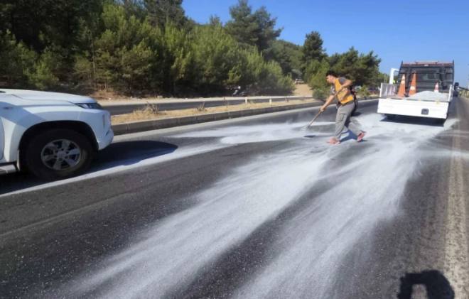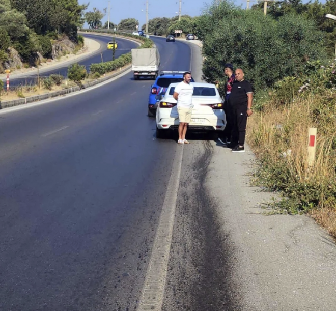 Muğla’nın Bodrum ilçesinde Bodrum- İzmir karayolunun 14. Kilometresindeki Sıralık Mevkii’nde bugün Bodrum’a gelmekte olan B.A. yönetimindeki 34 BEL 378 plakalı otomobilin yağ karter tıpasının çıkması sonucu yaklaşık 300 metrelik alan yağa bulandı.