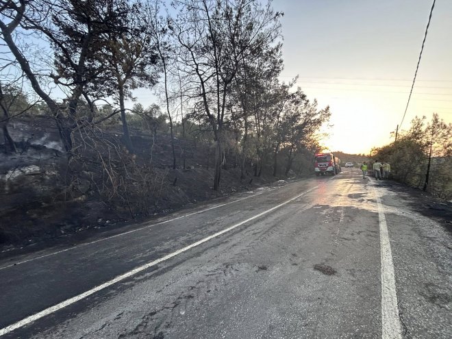 Milas-Güllük yolu üzerinde çıkan yangın nedeniyle jandarma ekipleri yolu trafiğe kapatarak söndürme çalışmalarına yardımcı oldu.