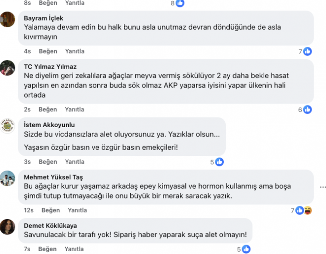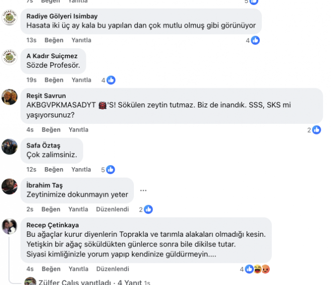 Vatandaşlar, taşıma işlemini “zeytin katliamının üzerini örtme çabası” olarak nitelendiriyor. Yüzlerce yorumda, taşınan ağaçların kuruyacağı, meyve veremeyeceği ve köylünün geleceğinin yok edildiği söyleniyor.